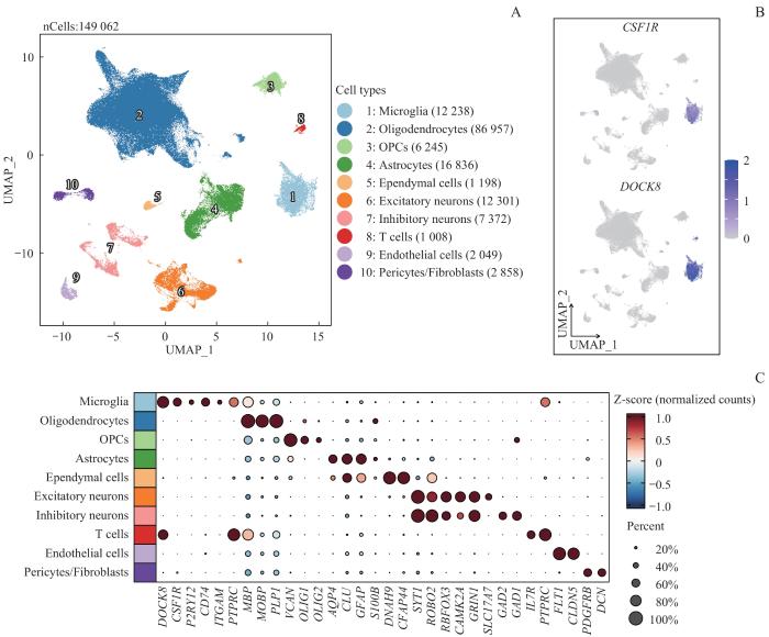 变异量最大的3 000个基因被选取作为高变基因,用于PCA分析和UMAP可视化。将全部细胞分为10个亚群(clusters),见图1A。Cluster 1,小胶质细胞,共有12 238个细胞,占比8.21%,以DOCK8、CSF1R、P2RY12、CD74为特征;Cluster 2,少突胶质细胞,共有86 957个细胞,占比58.33%,以MBP、MOBP、PLP1为特征;Cluster 3,少突胶质细胞前体细胞(oligodendrocyte precursor cells,OPCs),共有6 245个细胞,占比4.19%,以VCAN、OLIG1、OLIG2为特征;Cluster 4,星形胶质细胞,共有16 836个细胞,占比11.29%,以AQP4、CLU、GFAP为特征;Cluster 5,室管膜细胞,共有1 198个细胞,占比0.80%,以DNAH9、CFAP44为特征;Cluster 6,兴奋性神经元,共有12 301个细胞,占比8.25%,以SYT1、ROBO2、CAMK2A、SLC17A7为特征;Cluster 7,抑制性神经元,共有7 372个细胞,占比4.95%,以SYT1、ROBO2、GAD1、GAD2为特征;Clusters 8,T淋巴细胞,共有1 008个细胞,占比0.68%,以IL7R、PTPRC为特征;Cluster 9,内皮细胞,共有2 049个细胞,占比1.37%,以FLT1、CLDN5为特征;Cluster 10,周细胞/成纤维细胞,共有2 858个细胞,占比1.92%,以PDGFRB、DCN为特征。使用UMAP图在全部细胞中展示2种小胶质细胞标志基因表达量的空间分布,以确定小胶质细胞亚群(图1B)。不同细胞的标志基因用点图展示(图1C)。