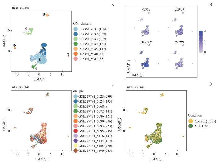 根据小胶质细胞经典标志基因和解剖部位来源,共鉴定出2 340个灰质胶质细胞。在来自灰质的小胶质细胞中进行降维聚类分析,共得到7个亚群,命名为GM_MG1‒7(Gray Matter_Microglia 1‒7)。GM_MG1亚群中包含了最多的细胞,共1 198个,占所有灰质小胶质细胞的51.20%;GM_MG7亚群中所包含的细胞数最少,占所有小胶质细胞的1.62%(图2A)。小胶质细胞的关键标志物CD74、CSF1R、DOCK8和PTPRC在所有亚群中均有表达,证明所取到的细胞中没有掺杂其他细胞(图2B)。UMAP图显示来自不同样本的细胞分布均匀,且未观察到某一样本的特异性亚群,说明样本间分布无批次效应(图2C)。MS组和对照组细胞在各个亚群的数量上未表现出明显的偏差,且未观察到对照组或MS组的特异性亚群(图2D)。