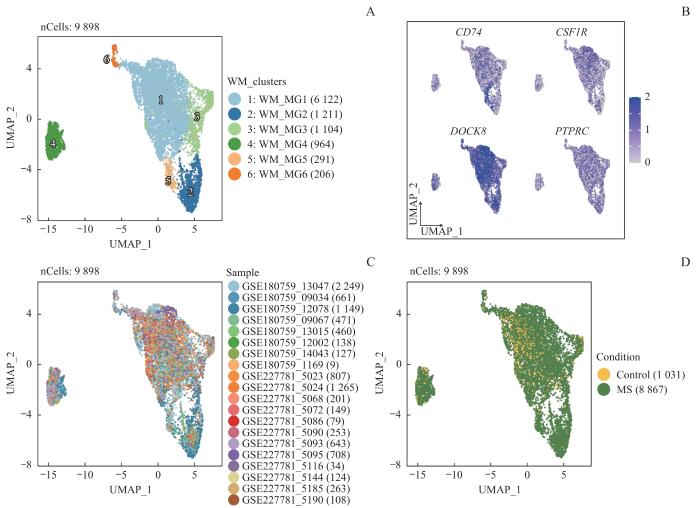 根据小胶质细胞经典标志基因和解剖部位来源,共鉴定出9 898个白质小胶质细胞。在来自白质的小胶质细胞中进行降维聚类分析,共得到6个亚群,命名为WM_MG1‒6(White Matter_Microglia 1‒6)。WM_MG1亚群中包含细胞数最多,共6 122个,占全部白质小胶质细胞的61.85%;WM_MG6亚群中包含的细胞数最少,共206个,占全部白质小胶质细胞的2.08%(图4A)。小胶质细胞的关键标志物CD74、DOCK8、CSF1R和PTPRC在各个亚群中的表达情况(图4B)表明,所获得的白质小胶质细胞中不掺杂其他杂质细胞。UMAP图显示,来自不同样本的细胞分布均匀,且未观察到某一样本的特异性亚群,说明样本间分布无批次效应(图4C)。在WM_MG2亚群和WM_MG5亚群中,观察到MS组细胞多于对照组细胞,在其他亚群中未观察到2组细胞数量的明显偏差,且未观察到对照组或MS组的特异性亚群(图4D)。