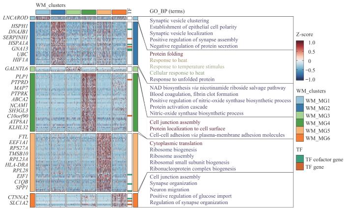 对白质小胶质细胞内的异质性进行分析(图6)。WM_MG1亚群中富集了包括突触囊泡聚集、上皮细胞极性的建立、突触组装的正向调节等生物学过程,且WM_MG1中P2RY12的表达上调,因此推测WM_MG1为稳态的小胶质细胞亚群。WM_MG2亚群中富集了蛋白质折叠、热响应、温度刺激响应等生物学过程。值得注意的是,WM_MG2亚群中富集到的DEGs和生物学过程,与图5B中MS组相比对照组上调的生物学过程有着高度的重合,如HSPH1、HSPD1、HSP90AA1、P4HA1等。上述基因在WM_MG2中的log2FC值均大于2,因此,推测WM_MG2为MS相关的疾病亚群。WM_MG3亚群中富集了包括烟酰胺核苷回收途径的NAD生物合成、凝血纤维蛋白凝块形成、一氧化氮合酶生物合成过程的正向调控等生物学过程,推测WM_MG3为活化的小胶质细胞,具有神经保护功能。WM_MG4亚群中富集了包括细胞连接组装、蛋白质在细胞表面的定位、细胞通过细胞膜黏附分子进行细胞黏附等生物学过程,结合WM_MG4上调表达的基因,如F13A1、MRC1、CD163、STAB1、COLEC12等,推测WM_MG4可能在大脑的损伤修复、抗炎、吞噬髓鞘等方面起重要作用。WM_MG5亚群富集了细胞质翻译、核糖体生物合成、核糖体组装等生物学过程;在基因层面,该亚群富集到了TREM2、APOE、CD68等基因(log2FC值均大于0.4,校正后的P值均小于0.05)。与核糖体相关的基因大量上调,说明WM_MG5表现出高度的代谢活跃性。WM_MG6亚群富集了细胞连接组装、突触组织、神经元迁移等生物学过程,说明WM_MG6亚群可能在促进神经系统的正常发育、神经连接的维护中发挥关键作用。DEGs分析和富集分析结果提示,白质小胶质细胞各个亚群间存在着较为清晰的DEGs和功能差异。