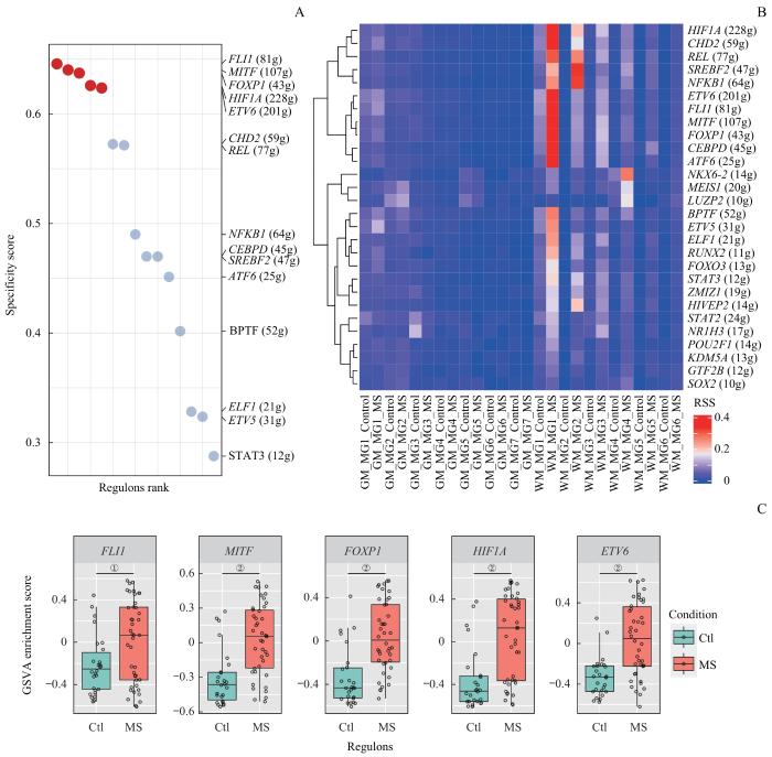 Note: A. Dot plot of RSS ranking among regulons in the MS group. ①P=0.008, ②P=0.000. B. Heatmap of regulon activity identified by SCENIC analysis. C. Box plot of GSVA enrichment analysis score by regulons from GSE179427. g—gene; Ctl—control.