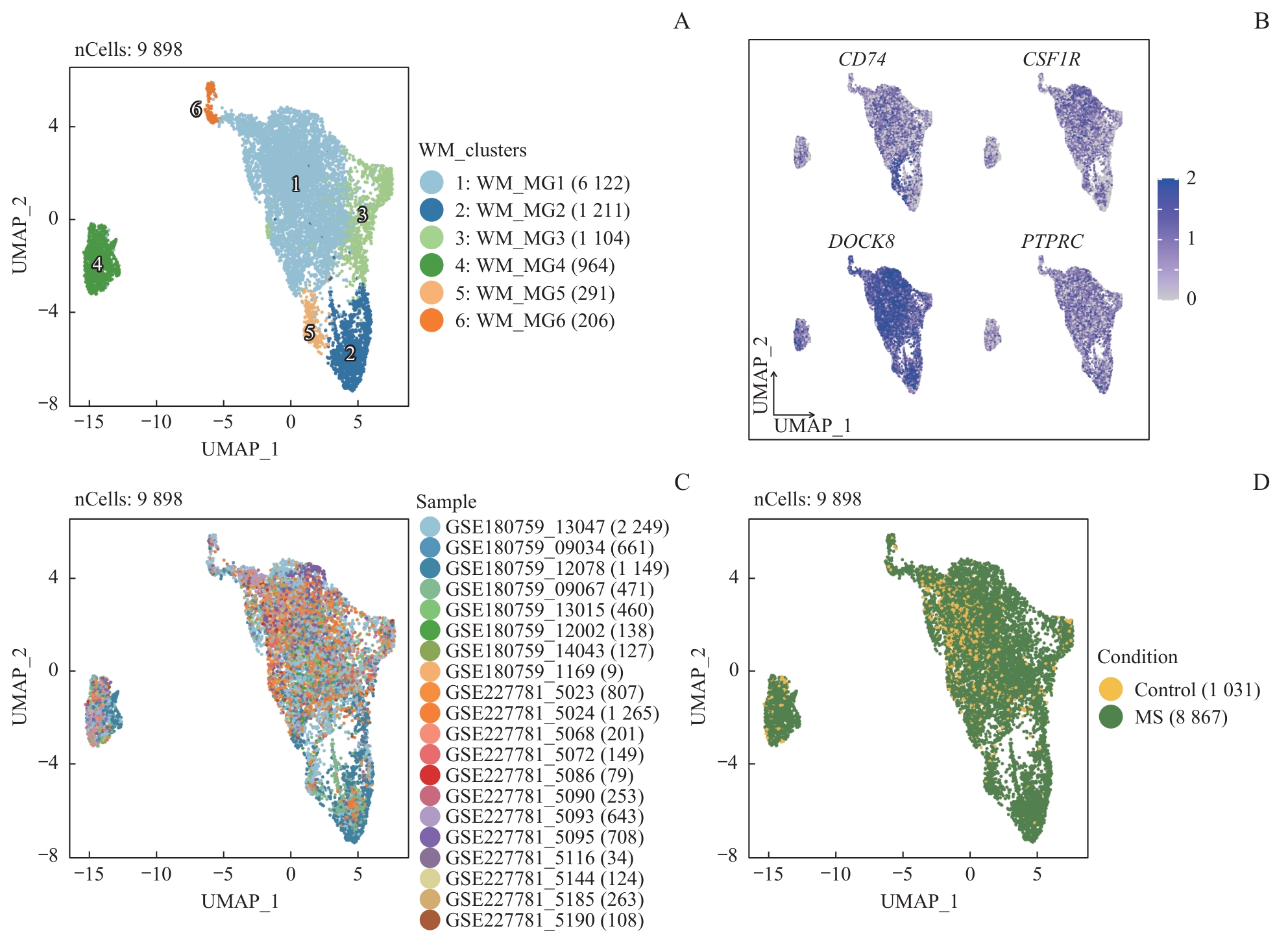 | 图4 白质小胶质细胞在MS中的异质性分析 Note: A‒D. UMAP plots of white matter microglia, color-coded by the subpopulations (A), normalized expression of microglia marker genes (B), samples (C), and MS condition (D). |