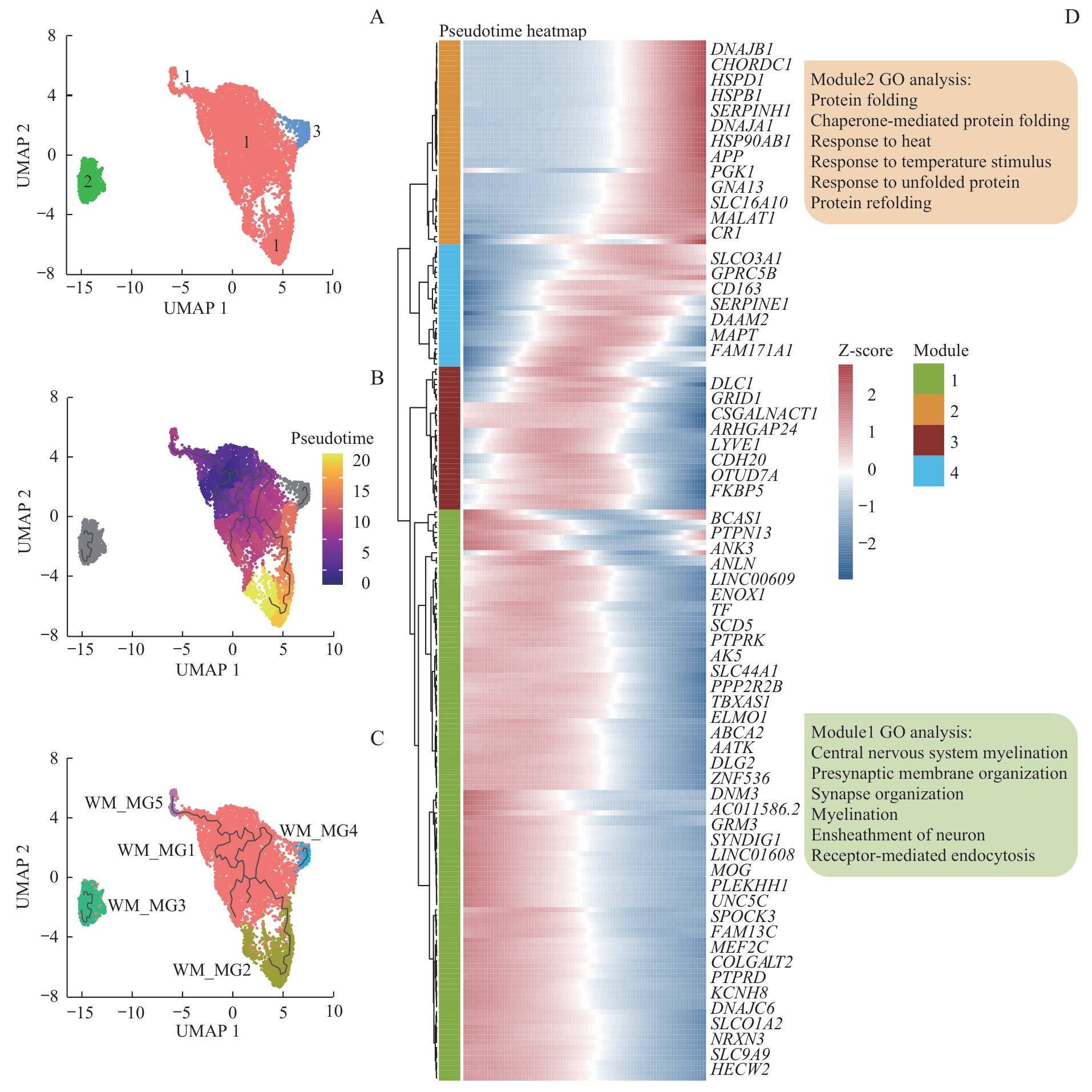 | 图7 白质小胶质细胞的拟时序分析 Note: A‒C. UMAP plots of white matter microglia, color-coded by the partition (A), pseudotime (B), and WM_clusters (C). D. Heatmap of gene expression profiles associated with cellular states based on pseudotime analysis. The horizontal axis represents cells arranged according to pseudotime, and the vertical axis displays genes that are correlated with pseudotime. |
