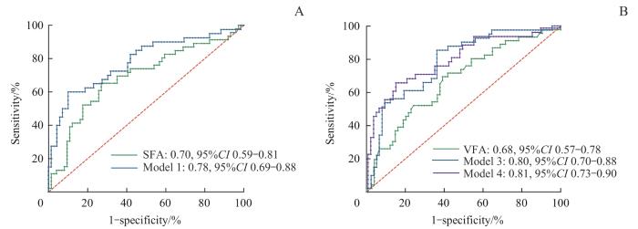 采用基于生物电阻法的内脏脂肪检测仪DUALSCAN HDS-2000(日本欧姆龙公司)测定SFA、VFA。采用FibroScan®(法国Echosens公司)测定肝脏硬度值(liver stiffness measurement,LSM)和受控衰减参数(controlled attenuation parameter,CAP)[10]。采用动脉硬化检测装置/血压脉波检查装置BP-203RPEⅢ(日本欧姆龙公司)测定踝臂指数(ankle brachial index,ABI)、臂踝脉搏波速度(brachial ankle pulse wave velocity,baPWV)。采用SD800彩色多普勒超声显像仪(荷兰飞利浦公司)测定颈动脉内膜中层厚度(intima-media thickness,IMT)。