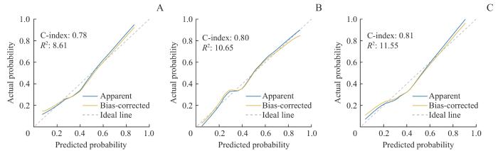Note: A. SFA-simple model. B. VFA-simple model. C. VFA-invasive model. The dashed grey lines represent perfect prediction (ideal line); the blue lines represent the entire cohort (apparent); the yellow lines, bias-corrected via bootstrapping (with 1 000 replicates), indicate observed nomogram performance (bias-corrected).