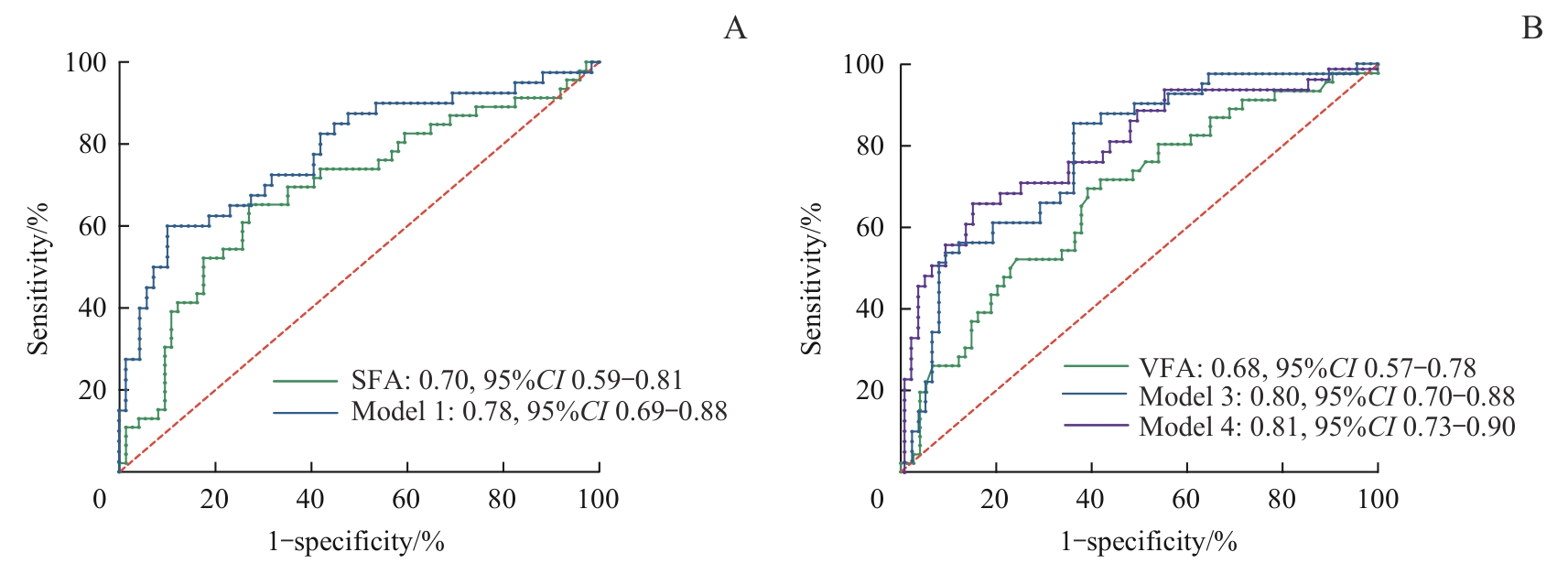 | 图1 预测β细胞第一时相分泌功能衰竭的ROC曲线 Note: A. Models including SFA for predicting depleted insulin secretion function. B. Models including VFA for predicting depleted insulin secretion function. |