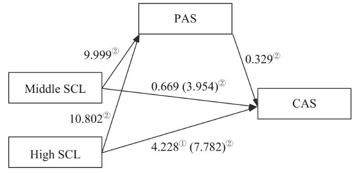 选择PROCESS宏程序中的Model-4,通过抽取5 000个Bootstrap样本估计中介效应的95%CI,以精神病理症状潜在类型为自变量,药物成瘾为因变量,年龄和吸毒年限为控制变量,分析心理痛苦的中介效应。各变量间相关性结果见表4,整体中介和部分中介分析结果见图2和表5。整体中介分析的结果显示,整体总效应检验的F(2,397)=20.510,P<0.001,表明2个分类的相对总效应不全为0;整体直接效应检验的F(2,396)=21.47,P=0.018,表明2个分类的相对直接效应不全为0。在进一步的相对中介分析中,以低SCL为参照水平,中SCL相对低SCL的相对中介95%的Bootstrap置信区间为2.271~4.370,不包括0,表明相对中介效应显著(a=9.999,b=0.329,ab=3.284),即中SCL类别的受试感受到的心理痛苦比低SCL受试多9.999(a=9.999),所以中SCL受试的药物成瘾程度也相应增大(b=0.329)。相对直接效应不显著(c′=0.669,P=0.447),表明心理痛苦完全中介了中SCL类受试的精神症状对药物成瘾的回归效应,中介效应占比83.08%。高SCL相对低SCL的相对中介95%的Bootstrap置信区间为2.323~4.992,不包括0,表明相对中介效应显著(a=10.802,b=0.329,ab=3.584),即高SCL类别的受试感受到的心理痛苦比低SCL的受试多10.802(a=10.802),所以高SCL受试的药物成瘾程度也相应增大(b=0.329)。相对直接效应显著(c′=4.228,P=0.005),表明心理痛苦部分中介了高SCL类受试的精神症状对药物成瘾的回归效应,中介效应占比45.88%。