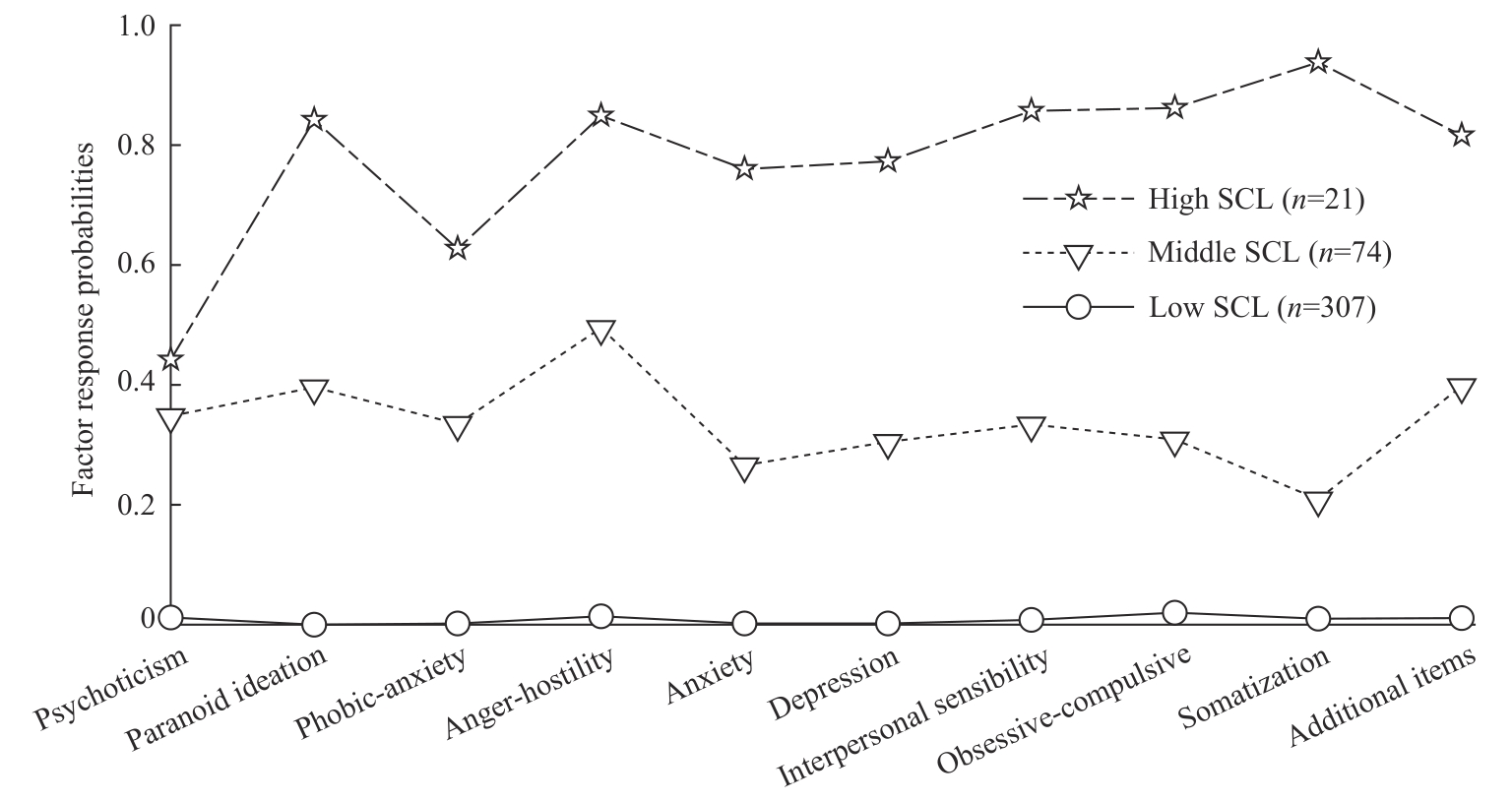 | Fig 1 Factor response probabilities of the 10 factors of SCL-90 scale across the three latent types |