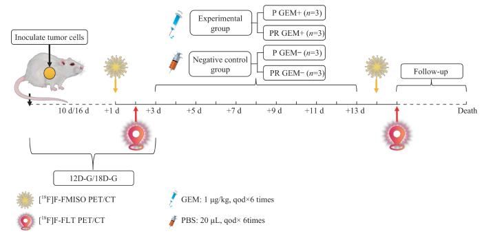5周龄BALB/c雄性裸鼠,购自上海灵畅生物科技有限公司,生产许可证号SCXK(沪)2018-0003;在上海交通大学医学院实验动物科学部饲养,动物使用许可证号SCXK(沪)2023-0041。将裸鼠随机分为P组和PR组,每组12只,于左侧腋窝皮下接种约1×107个细胞,待成瘤。需探讨肿瘤生长不同时期给予化疗对显像和预后的差异,因此设置亚组,每个亚组n=3,分别于接种肿瘤细胞后第12天、第18天开始给予GEM;同时设对照组给予磷酸盐缓冲液(PBS,碧云天),每个亚组n=3(图1)。