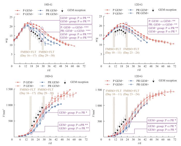 Weight of mice?GEM+ group vs GEM- group: P<0.001 after the final treatment in 18D-G (P); P=0.001 after the final treatment in 18D-G (PR); P=0.002 after the final treatment in 12D-G (P); P=0.007 after the final treatment in 12D-G (PR). P group vs PR group: P=0.002 before treatment and P<0.001 after the final treatment in 18D-G (GEM-) and in 18D-G (GEM+); P=0.004 after the final treatment in 12D-G (GEM-); P=0.031 after the final treatment in 12D-G (GEM+).