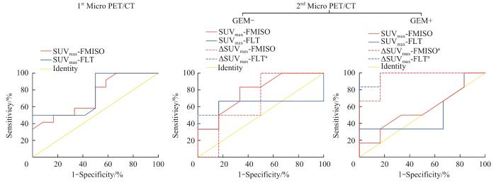 Note: 1st Micro PET/CT was performed before treatment. 2nd Micro PET/CT was performed after the completion of treatment. The GEM+ group received intraperitoneal injections of 1 μg/kg GEM every other day, while the GEM- group received intraperitoneal injections of 20 μl PBS every other day. The treatment was administered 6 times. For the 1st Micro PET/CT, each subgroup n=12, while for the 2nd Micro PET/CT, each subgroup n=6. a? AUC≥0.90 (AUC of ΔSUVmax-FLT in the GEM- group=0.90, AUC of ΔSUVmax-FMISO in the GEM+ group=0.94, AUC of ΔSUVmax-FLT in the GEM+ group=0.97).