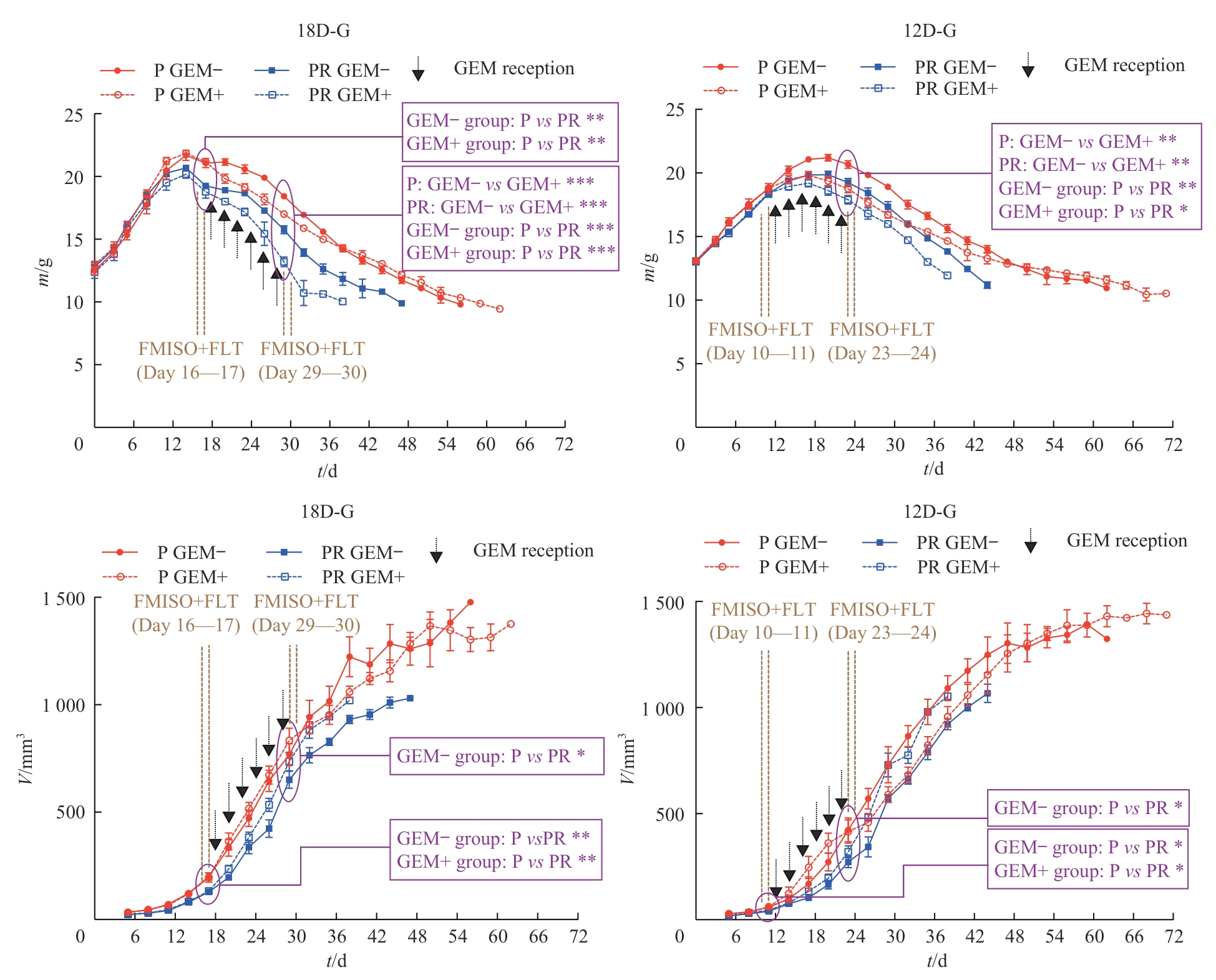 | 图2 裸鼠体质量与肿瘤体积追踪记录 Note: After inoculation of tumor cells, treatment was initiated on day 18 (18D-G) or day 12 (12D-G). The GEM+ group received intraperitoneal injections of 1 μg/kg GEM every other day, while the GEM- group received intraperitoneal injections of 20 μl PBS every other day. The treatment was administered 6 times. The arrows indicate the time points of GEM administration. Each subgroup: n=3. ?—P<0.05; ??—P<0.01; ???—P<0.001. The purple circles indicate the statistical differences in weight of mice and volume of tumor before and after treatment in each group. Weight of mice?GEM+ group vs GEM- group: P<0.001 after the final treatment in 18D-G (P); P=0.001 after the final treatment in 18D-G (PR); P=0.002 after the final treatment in 12D-G (P); P=0.007 after the final treatment in 12D-G (PR). P group vs PR group: P=0.002 before treatment and P<0.001 after the final treatment in 18D-G (GEM-) and in 18D-G (GEM+); P=0.004 after the final treatment in 12D-G (GEM-); P=0.031 after the final treatment in 12D-G (GEM+). Volume of tumor?P group vs PR group: P=0.003 before treatment and P=0.036 after the final treatment in 18D-G (GEM-); P=0.010 before treatment in 18D-G (GEM+); P=0.024 before treatment and P=0.014 after the final treatment in 18D-G (GEM-); P=0.030 before treatment in 18D-G (GEM+). |