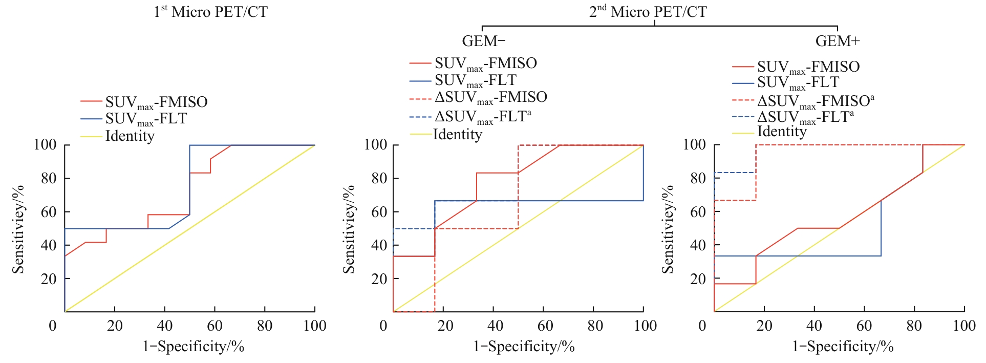 | 图3 治疗前后双核素显像各半定量参数的ROC曲线 Note: 1st Micro PET/CT was performed before treatment. 2nd Micro PET/CT was performed after the completion of treatment. The GEM+ group received intraperitoneal injections of 1 μg/kg GEM every other day, while the GEM- group received intraperitoneal injections of 20 μl PBS every other day. The treatment was administered 6 times. For the 1st Micro PET/CT, each subgroup n=12, while for the 2nd Micro PET/CT, each subgroup n=6. a? AUC≥0.90 (AUC of ΔSUVmax-FLT in the GEM- group=0.90, AUC of ΔSUVmax-FMISO in the GEM+ group=0.94, AUC of ΔSUVmax-FLT in the GEM+ group=0.97). |