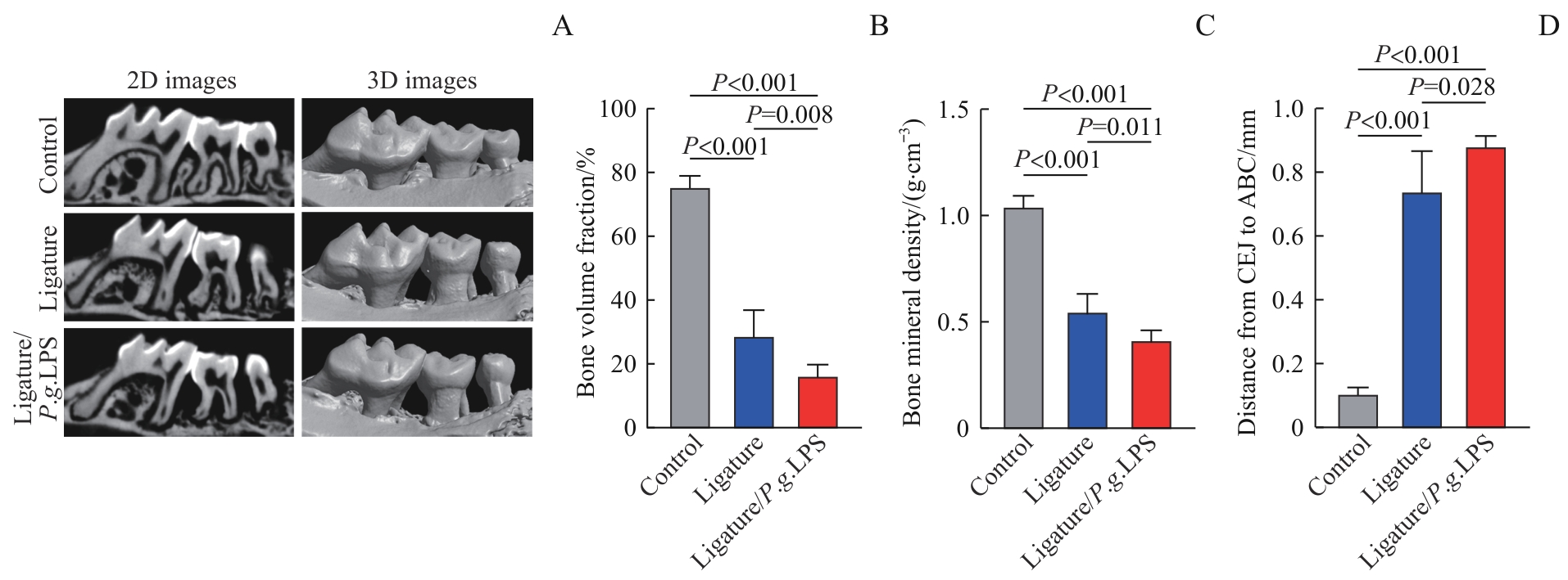 | 图3 小鼠左侧上颌骨Micro-CT图像 Note: A. Micro-CT 2D and 3D images of the left maxilla in mice. B. Bone volume fraction. C. Bone mineral density. D. Distance from the cemento-enamel junction (CEJ) to the alveolar bone crest (ABC). |