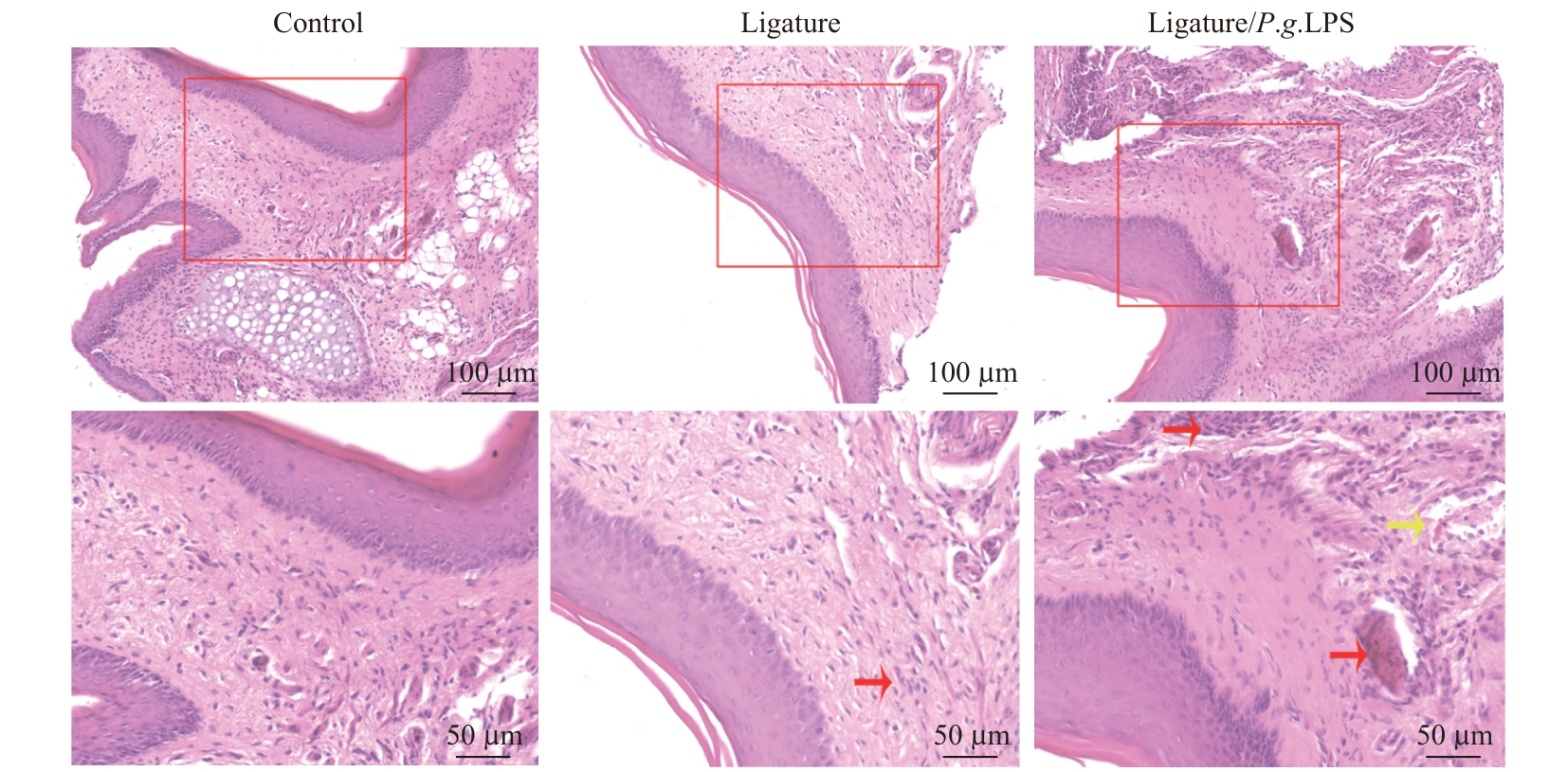| 图5 小鼠上颌左侧第二磨牙处牙龈组织H-E染色结果 Note: Red arrows indicate inflammatory cells; yellow arrows indicate edema and necrosis. |