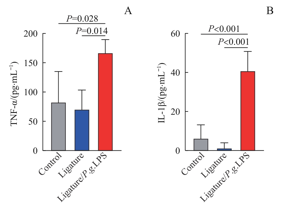 | 图6 小鼠血清中TNF-α、IL-1β的含量 Note: A. Levels of TNF-α. B. Levels of IL-1β. |