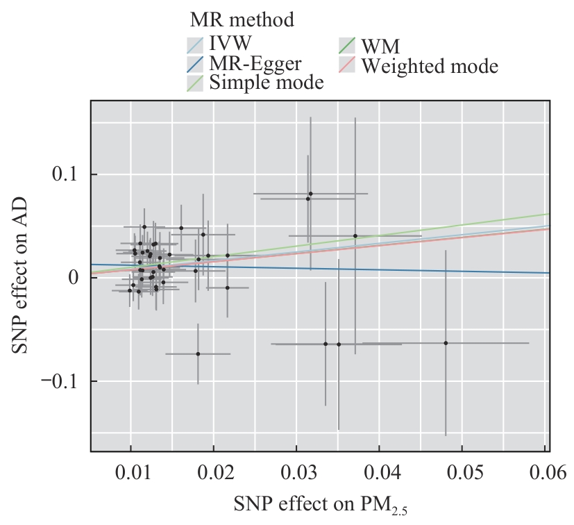 | 图2 SNP对PM2.5 和AD效应的散点图分析 Note: Each black point on the plot represents an individual SNP, with its position on the exposure (horizontal axis) and the outcome (vertical axis). Error bars indicate the standard error (SE) for each SNP. |