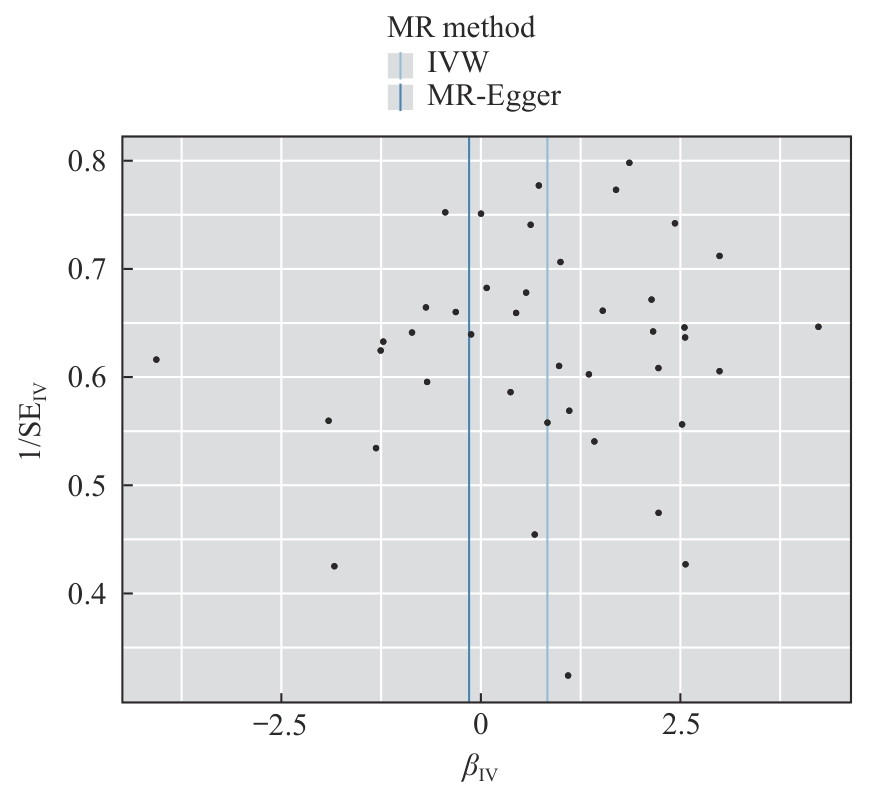 | 图5 PM2.5 对AD效应的漏斗图分析 Note: Each black point on the plot represents an individual SNP, with the vertical axis displaying the effect size and the horizontal axis representing the standard error (SE). The central line indicates the overall estimated effect size. IV‒instrumental variable. |