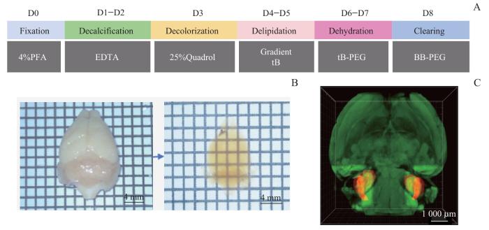 PEGASOS组织透明化流程:① 将4%PFA固定后的样品用PBS洗3次,每次10 min。② 加入EDTA脱钙液,于4 ℃摇床上脱钙2 d,每天换液。③ PBS洗3次,每次10 min。④ 加入25% Quadrol脱色液,于37 ℃摇床上脱色1 d。⑤ 依次更换30%、50%、70% tB脱脂液,分别于37 ℃摇床上脱脂约6、6、12 h。⑥ 加入脱水液tB-PEG,于37 ℃摇床上脱水2 d,每天换液。⑦ 加入透明液BB-PEG,于37 ℃摇床上透化1 d。