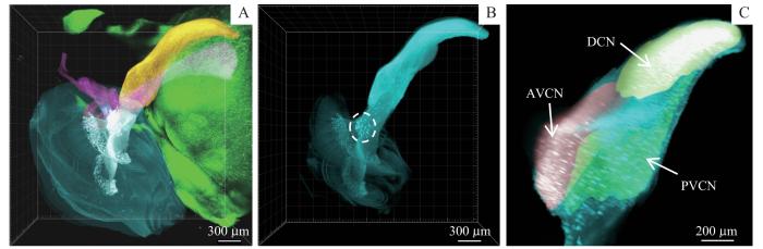 Note: A. 3D imaging of the cochlea and its surrounding tissues. The regions were segmented using different colours, including the cochlea (cyan), spiral ganglions and auditory nerves (off-white), cochlear nucleus (gold), vestibule and vestibular nerves (pink), and brainstem tissues (green). B. Cochlea-cochlear nucleus neural pathway. The circle indicates cochlear root neurons. C. Three subregions of the cochlear nucleus, including AVCN (red), PVCN (green), and DCN (gold).