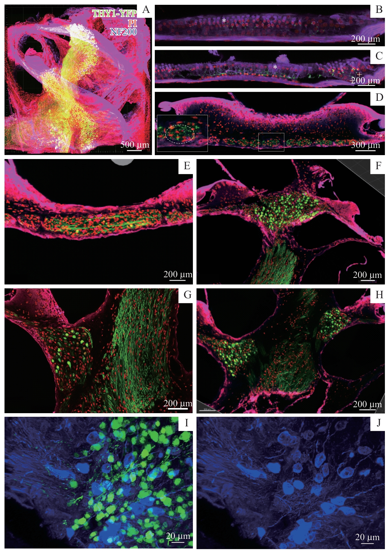 | 图3 耳蜗荧光染色及0.24 μm×0.24 μm×1.50 μm分辨率的三维整体成像 Note: A. 3D image of the cochlea. B. Distribution of outer hair cells (marked by *) in relation to THY1+ nerve fibers (green). C. Distribution of inner hair cells (marked by *) and supporting cells (marked by +) in relation to THY1+ nerve fibers (green). D. Position of nerve fiber bundles (green) in relation to the cochlear aperture. E‒H. Paths of THY1+ nerve fibers (green) in the cochlea. I/J. Distribution of NF200 expression (blue) in different parts of the cochlea. Red represents PI; green represents THY1-YFP; |