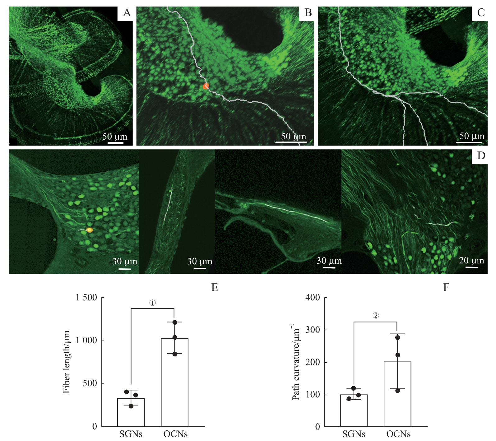 | 图4 耳蜗内单根神经纤维追踪结果及2种神经纤维的路径差异 Note: A. 3D images of local spiral ganglia and fibers at a resolution of 0.24 μm×0.24 μm×1.50 μm. B/C. Two types of fiber pathways obtained by Imaris software tracing, an auditory nerve fiber (B) and MOC/LOC fibers (C). D. Local magnification of the 3D imaging of cochlear and labelling of fiber tracing at high resolution. E/F. Comparison of fiber length (E) and path curvature (F) between localized auditory nerve fibers and the MOC/LOC fibers within the cochlea. Neuronal designations were used to represent their corresponding fibers, with SGNs referring to auditory nerve fibers and OGNs (olivocochlear neurons) referring to MOC/LOC fibers. The orange/yellow dots represent the cell bodies of the tracked auditory nerves in B and D. ①P=0.002, ②P=0.113. |