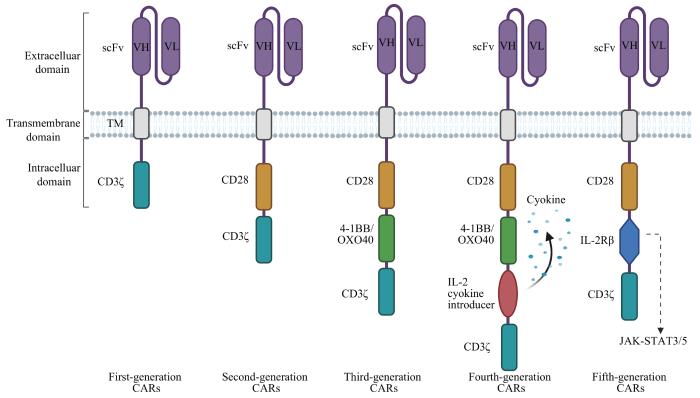 ... 当前CAR的结构经历了5代变化(图1).一代CAR-T细胞胞内结构域包含CD3ζ链,但由于缺少共刺激结构域,其扩增能力和持久性欠佳、抗癌活性不足.二代CAR-T细胞在一代基础上增加了1个共刺激结构域(CD28、4-1BB或OXO40等),增殖能力、持久性和细胞毒性均显著提高.三代CAR-T细胞包含2种共刺激结构域以进一步增强其信号激活、靶向毒性并延长增殖,但由于其活性增加且不可控,可能导致细胞因子风暴、多器官衰竭甚至死亡等严重不良反应,临床上与二代CAR-T细胞相比不具优势[8-10].四代CAR-T细胞添加白细胞介素-2(interleukin-2,IL-12)等免疫调节因子以激活先天性免疫细胞并增强T细胞活化,一定程度上克服肿瘤微环境中的免疫抑制因素,更有力地攻击实体肿瘤.五代CAR-T细胞涉及对传统CAR结构进行改造,如添加IL-2受体β链触发细胞因子Janus激酶-信号转导与转录激活因子3/5(Janus kinase-signal transducer and activator of transcription 3/5,JAK-STAT3/5)信号转导以增强CAR-T细胞活性[11],以及使用CRISPR-Cas9技术敲除T细胞中的人类白细胞抗原Ⅰ类分子(human leukocyte antigen class Ⅰ,HLA-Ⅰ)和内源性T细胞受体制备通用型CAR-T细胞,降低CAR-T细胞被排斥和GVHD的风险[12]. ...