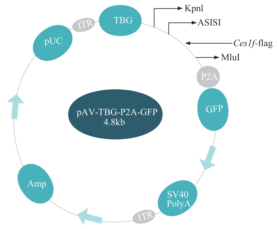 | 图1 载体结构图谱 Note: The objective gene is located in the pAV-TBG-P2A-GFP vector. The TBG promoter drives the expression of the target gene. The Kozak sequence GCCACC is located upstream of the target gene. A flag tag is added to the C-terminus of the target gene. The target gene and GFP are expressed in a non-fusion manner through the P2A sequence. Moreover, there are ASIS I/MluI restriction sites at both ends of the gene. |