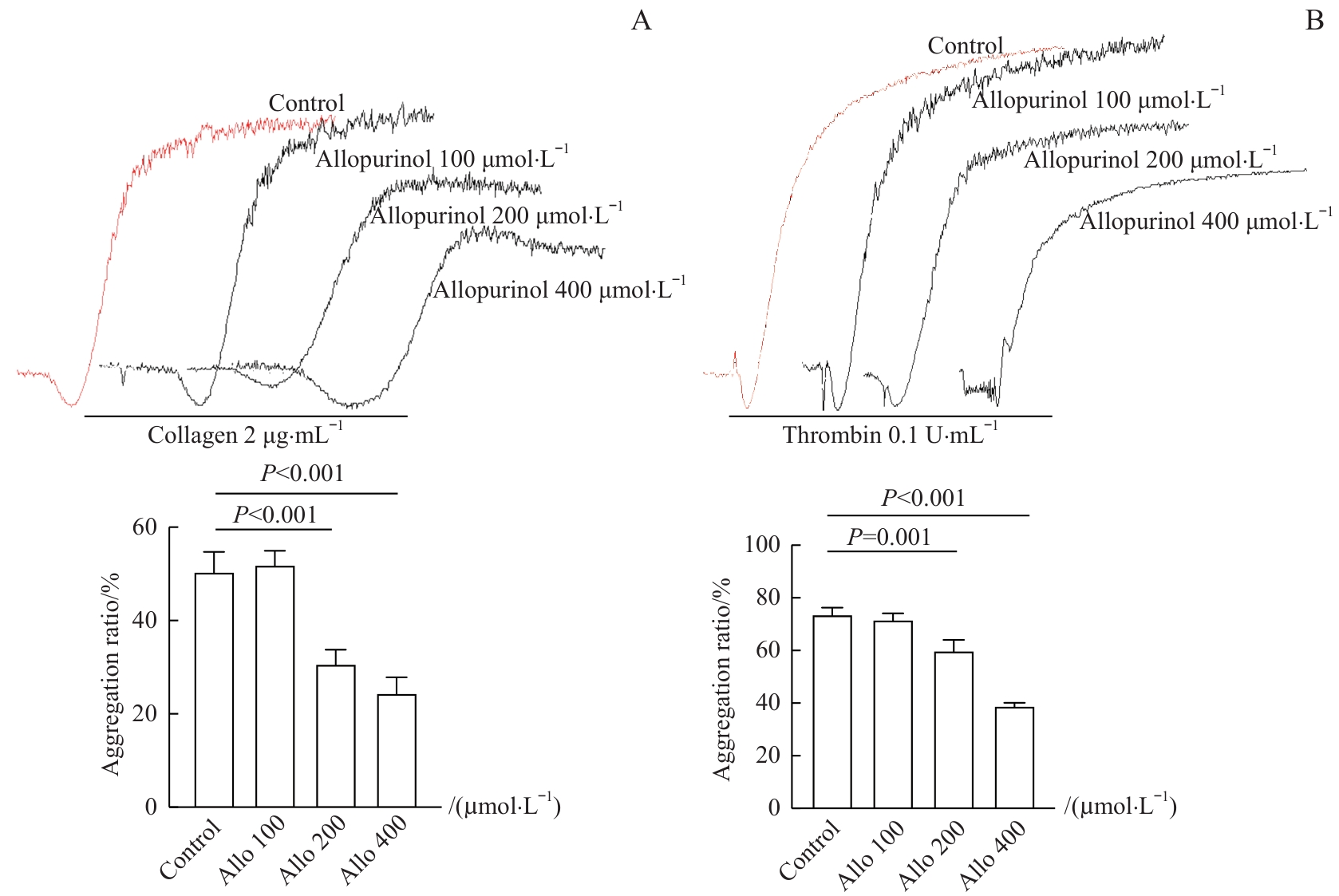 | 图5 别嘌呤醇对胶原和凝血酶诱导的血小板聚集的影响 Note: Representative platelet aggregation and summary data from 3 experiments. A. 2 μg·mL-1 collagen. B. 0.1 U·L-1 thrombin. Allo—allopurinol. |