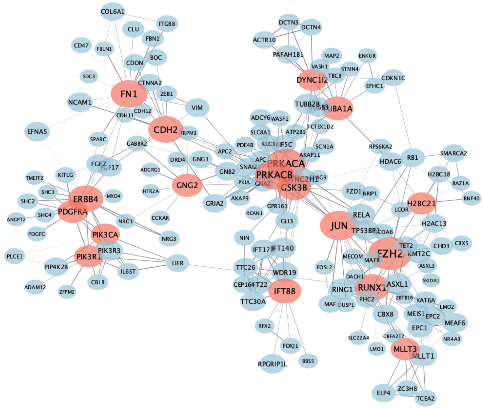 | 图6 PPI网络分析揭示下游候选中心基因 Note: The thickness of the edge in the network diagram represents the interaction strength between the two proteins, and the size of the node represents the degree. The red circles represent the protein with degree≥10, and the others represent proteins that interact with the red proteins. |