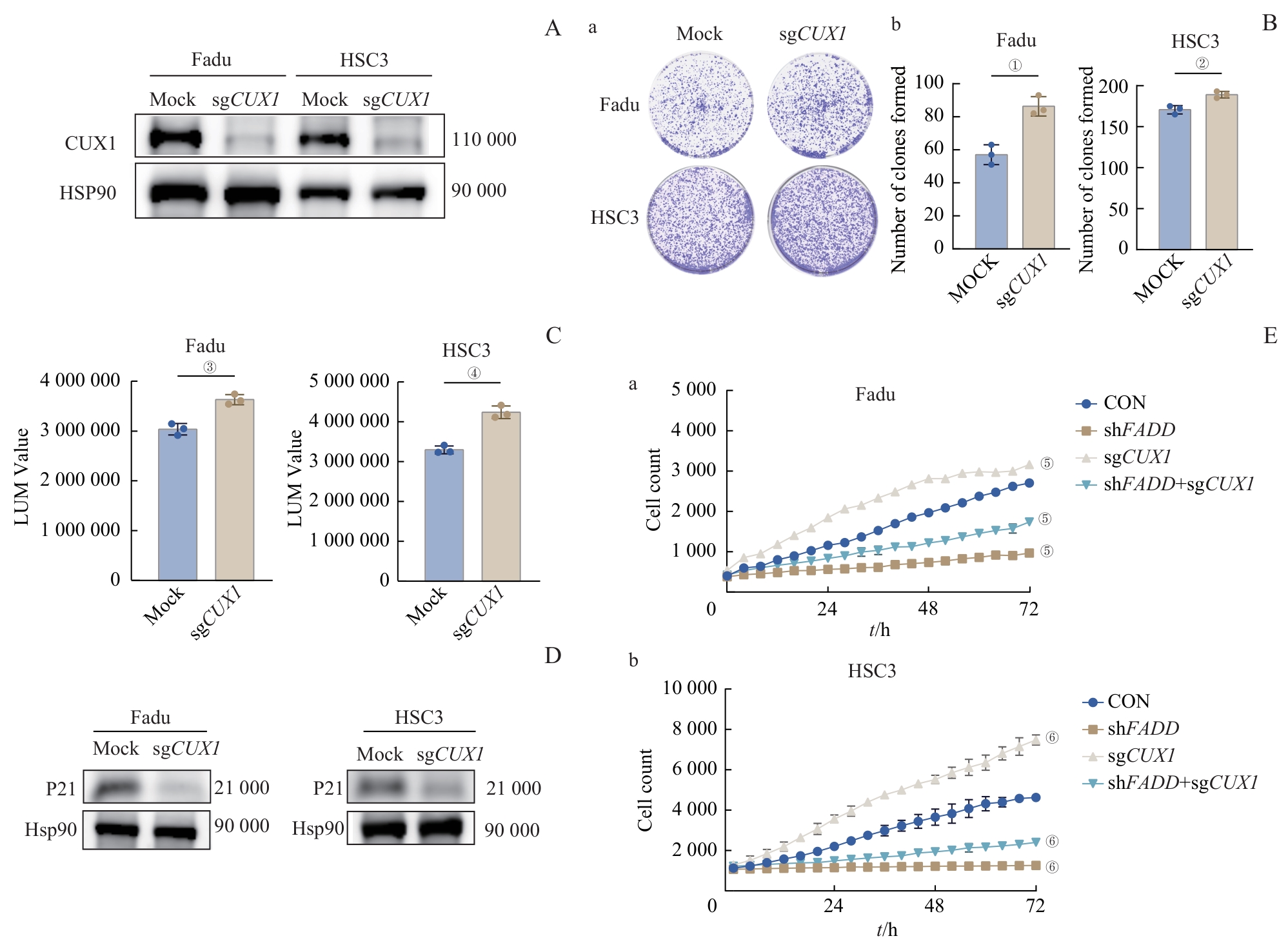 | 图5 FADD通过CUX1调控HNSCC细胞增殖 Note: A. Detection of CUX1 expression in HSC3 and Fadu cells after CUX1 knockout by Western blotting. B. Plate colony formation assay in FadusgCUX1 and HSC3sgCUX1 cells. C. Cell viability of FadusgCUX1 and HSC3sgCUX1 cells. D. Detection of P21 after CUX1 knockout in HSC3 and Fadu cells by Western blotting. E. The effect of CUX1 knockout on proliferation in stable-FADD-knockdown Fadu and HSC3 cells. ①P=0.004, ②P=0.008, ③P=0.001, ④P=0.001; ⑤P<0.001, compared with the FaduMOCK group; ⑥P<0.001 compared with the HSC3MOCK group. |