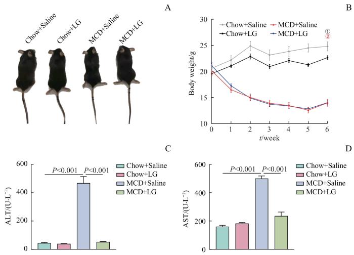 Note: A. Representative pictures of mice in each group. B. Body weight changes after 6 weeks. C/D. ALT (C) and AST (D) levels treated with liraglutide after 4 weeks. ①P=0.043, compared with the Chow+LG group; ②P<0.001, compared with the MCD+Saline group. LG—liraglutide.