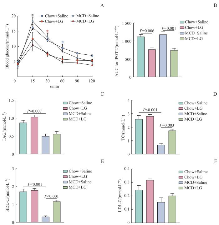 Note: A. Resluts of IPGTT. B. AUC for IPGTT. C. Serum TAG levels. D. Serum TC levels. E. Serum HDL-C levels. F. Serum LDL-C levels. ①P=0.026, ②P=0.015, ③P=0.001, MCD+Saline vs MCD+LG.