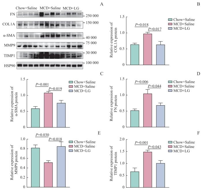 Note: A. Expression of FN, COL1A, α-SMA, MMP9, TIMP1, and HSP90 proteins detected by Western blotting. B-F. The relative expression levels of COL1A (B), α-SMA (C), FN (D), MMP9(E), and TIMP1 (F) proteins in the liver of mice.