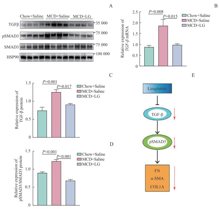 Note: A. Expression of TGF-β, pSMAD3, SMAD3, and HSP90 proteins detected by Western blotting. B. The relative expression level of TGF-β mRNA in the liver of mice. C/D. The relative expression levels of TGF-β (C) and pSMAD3/SMAD3 (D) proteins in the liver of mice. E. Working plot of liraglutide decreasing the TGF-β/smad3 signaling and reducing the expression of FN, α-SMA, and COL1A.
