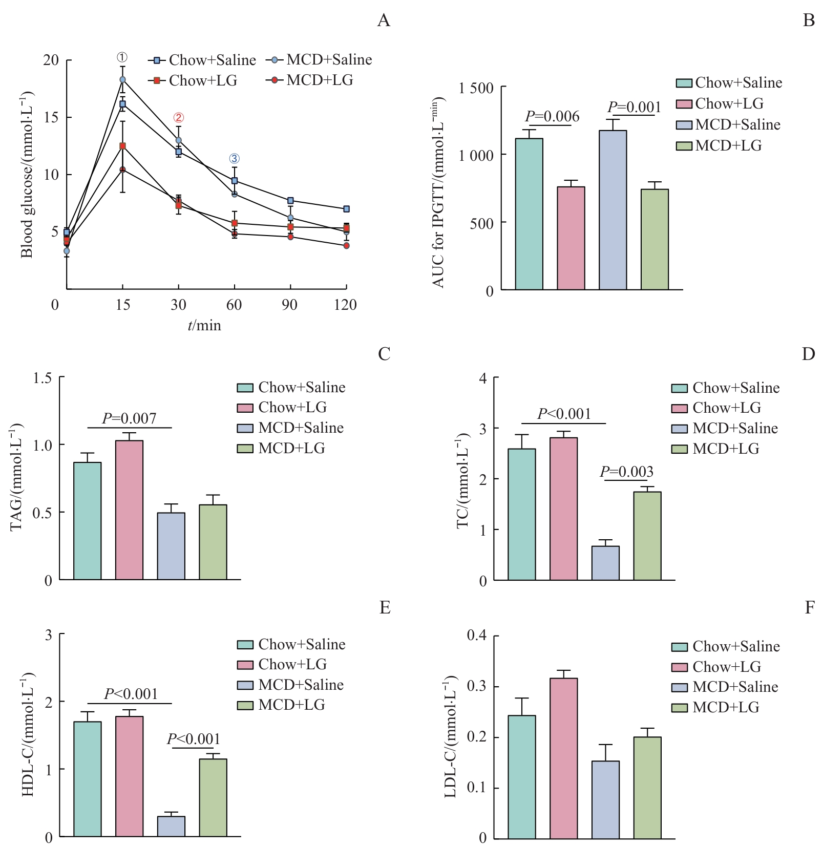 | 图2 利拉鲁肽对小鼠糖代谢与脂代谢的影响 Note: A. Resluts of IPGTT. B. AUC for IPGTT. C. Serum TAG levels. D. Serum TC levels. E. Serum HDL-C levels. F. Serum LDL-C levels. ①P=0.026, ②P=0.015, ③P=0.001, MCD+Saline vs MCD+LG. |