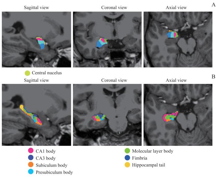 Note: A. Subfields of the right amygdala. B. Subfields of the right hippocampus.