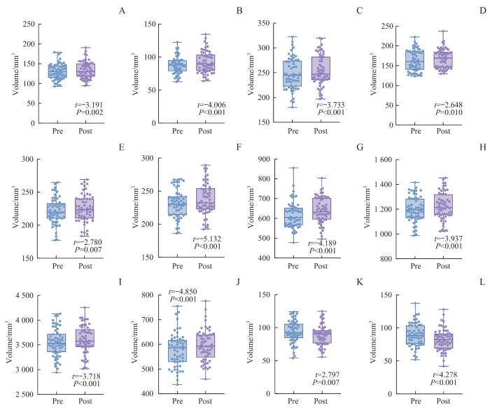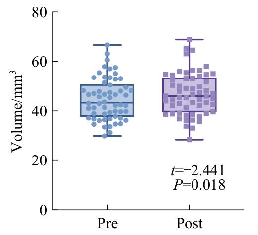 事后配对样本t检验显示,右侧中央核体积在TMS干预后增大,差异有统计学意义(t=-2.441,P=0.018),结果见图2;左侧外侧核体积在TMS干预后减小(t=2.127,P=0.038),但未能通过多重比较校正。