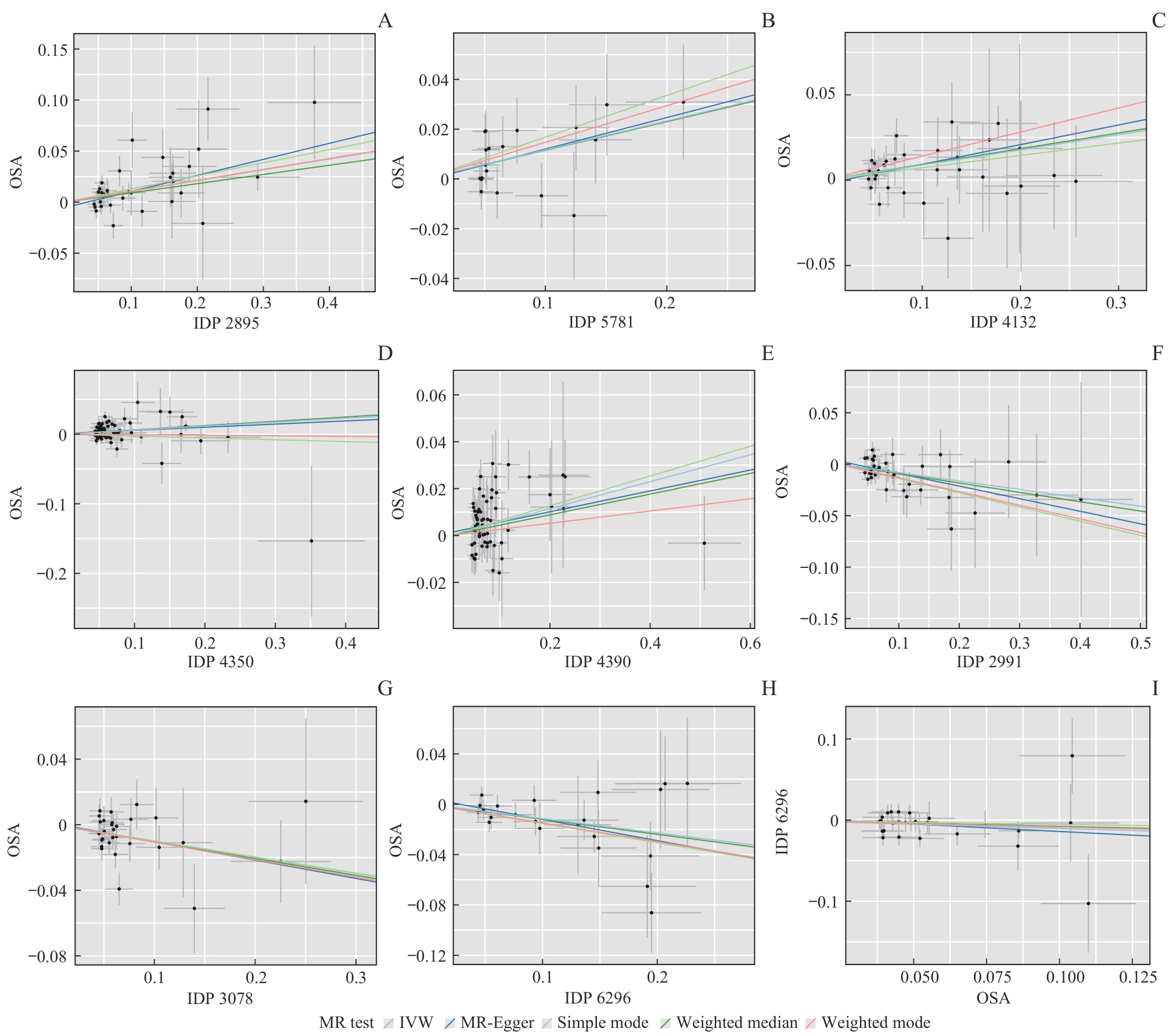 | 图3 IDP与OSA的遗传关联效应散点图 Note: A. Scatterplot of SNP effects on IDP 2895 and OSA. B. Scatterplot of SNP effects on IDP 5781 and OSA. C. Scatterplot of SNP effects on IDP 4132 and OSA. D. Scatterplot of SNP effects on IDP 4350 and OSA. E. Scatterplot of SNP effects on IDP IDP 4390 and OSA. F. Scatterplot of SNP effects on IDP 2991 and OSA. G. Scatterplot of SNP effects on IDP 3078 and OSA. H. Scatterplot of SNP effects on IDP 6296 and OSA. I. Scatterplot of SNP effects on OSA and IDP 6296. |