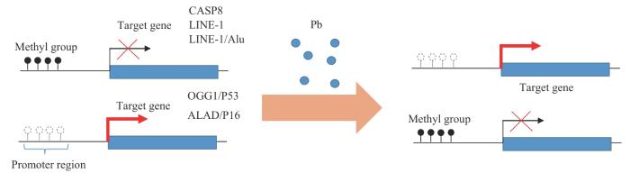 铅暴露也会导致特定位点基因启动子的高甲基化。在以12.5 mg/kg(每周3次)醋酸铅灌胃处理的10周龄Sprague-Dawley大鼠大脑皮质中,有研究观察到抑癌基因P53和DNA修复蛋白8-氧鸟嘌呤DNA糖苷酶(8-oxoguanine DNA glycosylase,OGG1)基因启动子的高甲基化[20];前者具有控制细胞周期进程、保护DNA完整性、预防肿瘤发生的作用,后者参与DNA碱基修复,表达调控相关基因的表达,二者基因启动子的高甲基化可能与实验中铅暴露鼠大脑皮层细胞凋亡增加及DNA损伤加剧等现象有关。这一现象也同样在职业暴露工人的人群研究中得以复现[19]。此外,铅暴露也与δ-氨基-γ-酮戊酸脱氢酶(δ-aminolevulinic acid dehydratase,ALAD)[21]以及P16[18]基因启动子高甲基化相关。ALAD的抑制可导致δ-氨基-γ-酮戊酸(δ-aminolevulinic acid,ALA)蓄积,进而引发血液系统的氧化损伤;而P16基因在细胞周期调控中发挥重要作用,其表达抑制可能增加肿瘤发生的风险。总之,铅引起的特定位点高甲基化主要与抑癌基因表达抑制和氧化应激损伤等效应密切相关。