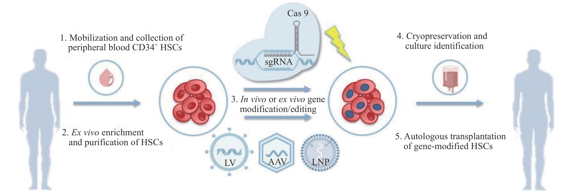 | 图1 地中海贫血基因治疗策略示意图 Note: HSCs—hematopoietic stem cells; Cas9—CRISPR-associated protein 9; sgRNA—single guide RNA; LV—lentiviral; AAV—adeno-associated virus; LNP—lipid nanoparticle. |