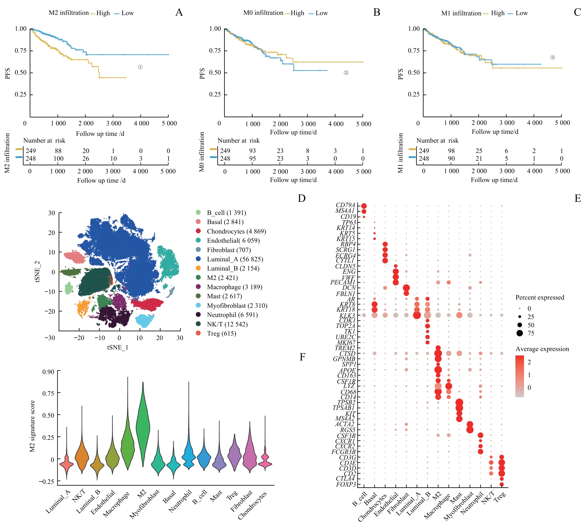 | 图1 PCa中M2巨噬细胞相关特征的鉴定 Note: A‒C.Comparison of PFS between low and high infiltration groups for M2 (A), M0 (B) and M1 (C) macrophages. D. Dimension reduction plot displaying the composition of 14 major cell clusters derived from prostate cancer samples. E. Bubble plot showing the marker genes of each cell cluster. F. Violin plot presenting the M2 signature scores across each cell cluster. ①P<0.001, ②P=0.830, ③P=0.700. |