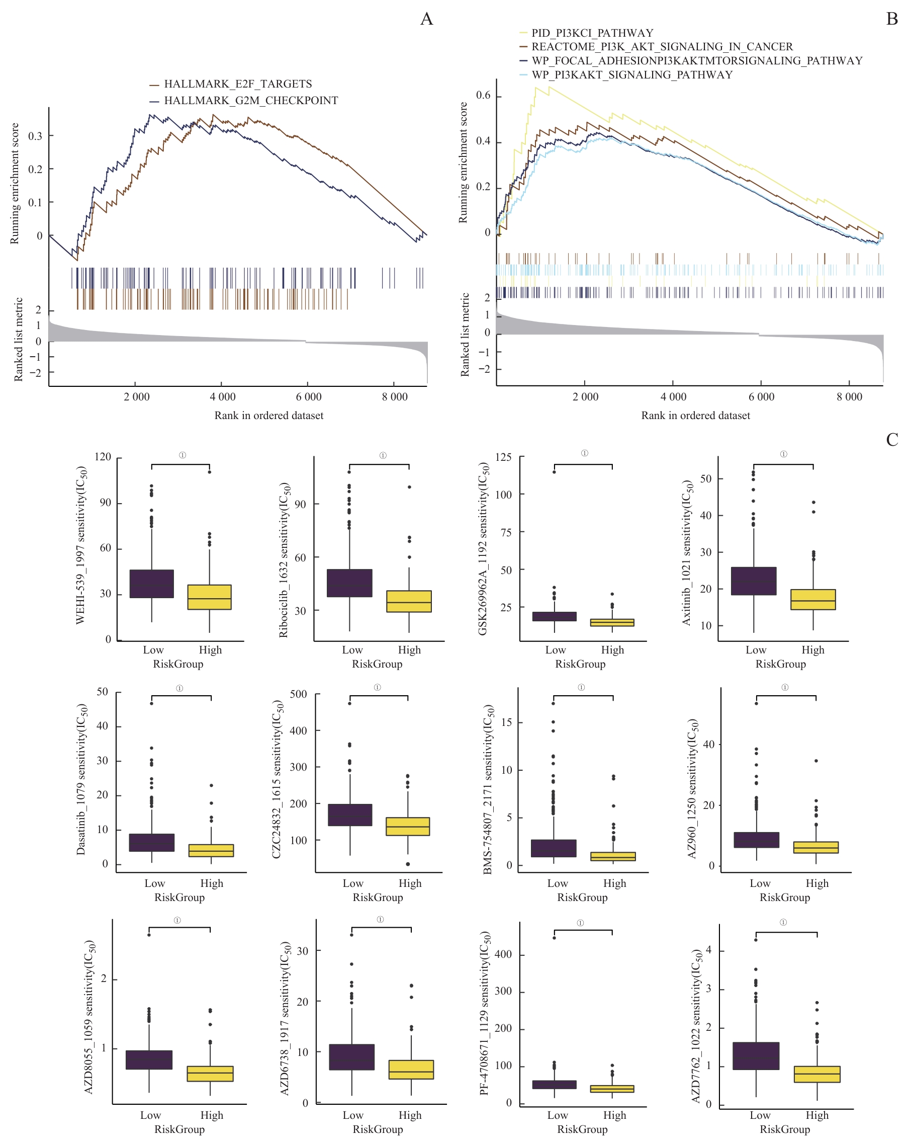 | 图8 潜在药物预测 Note: A/B. GSEA of potential drug resistance-related pathways. C. A comprehensive analysis of drug sensitivity between the high and low Risk Score groups. ①P<0.001. |