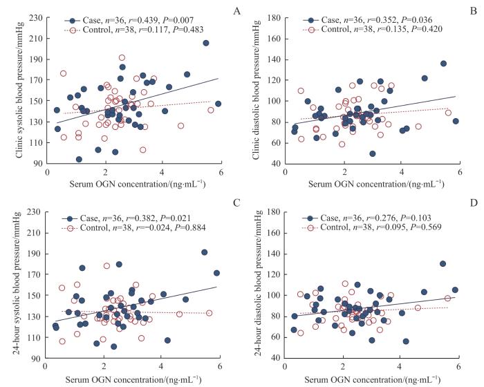 Association of serum OGN level with clinic and 24-hour ambulatory blood pressure