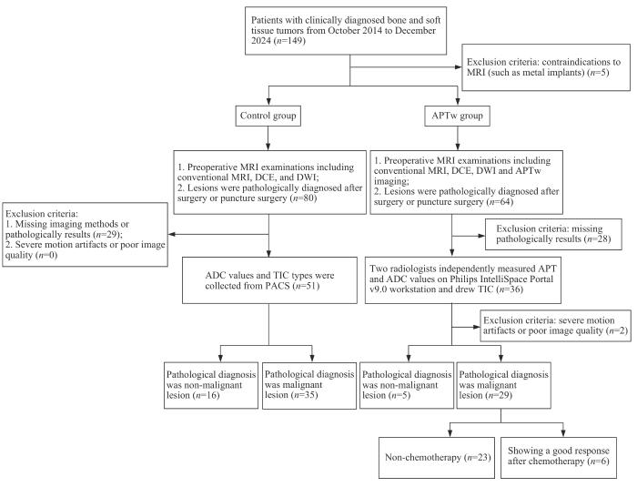 Objective ·To preliminarily investigate the value of high-order functional magnetic resonance imaging in the evaluation of benign and malignant bone and soft tissue tumors and the changes after chemotherapy. Methods ·Patients clinically diagnosed with bone and soft tissue tumors at the Department of Orthopaedics, Shanghai Ninth People 's Hospital, Shanghai Jiao Tong University School of Medicine, from October 2014 to December 2024 were enrolled. The patients were divided into a control group and an amide proton transfer-weighted imaging (APTw) group according to the imaging method. All patients underwent conventional magnetic resonance imaging (MRI), diffusion-weighted imaging (DWI), and dynamic contrast-enhanced imaging (DCE) before surgery. Patients in the APTw group received additional APTw imaging. Both groups were divided into non-malignant and malignant lesion subgroups according to pathological results. According to whether the patients received chemotherapy before enrollment, the patients with malignant lesions in the APTw group were further divided into malignant group without chemotherapy and malignant group with chemotherapy. Clinical and imaging data, including APT values, apparent diffusion coefficient (ADC), and time-intensity curves (TICs) from the largest tumor section, were collected and analyzed to assess the diagnostic performance of APTw, DWI, and DCE, and to evaluate changes after chemotherapy. Results ·Eighty-five patients were enrolled, including 51 males and 34 females, with ages ranging from 10 to 84 years, and a mean age of (43.05±17.62) years. There were 51 patients in the control group (16 with non-malignant lesions and 35 with malignant lesions) and 34 patients in the APTw group (5 with non-malignant lesions and 29 with malignant lesions; 23 malignant lesions without chemotherapy and 6 malignant lesions with chemotherapy). The clinical and imaging data showed that only the tumor margin of the control group and the maximum tumor diameter of the APTw group had statistically significant differences in their malignant and non-malignant lesion groups ( P<0.05). In the APTw group, there was a statistically significant difference in APT values between the malignant lesion group and the non-malignant lesion group ( P<0.001). Further analysis showed that the APT values in the malignant group without chemotherapy were significantly lower than that in the malignant group with chemotherapy ( P<0.001). However, there were no statistically significant differences in APT values between the malignant group with chemotherapy and the non-malignant lesion group ( P>0.05). There were no significant differences in ADC values and TIC types between malignant and non-malignant lesion groups in the control group and the APTw group ( P>0.05). The area under the curve (AUC) of the diagnostic model in the APTw group (MRI+DWI+DCE+APTw) for distinguishing malignant from benign tumors was significantly higher than that of the control group (MRI+DWI+DCE) ( P<0.05). The Youden index and specificity of the diagnostic model in the APTw group were higher than those in the control group. Conclusion ·As a high-order functional MRI technique, APTw imaging is capable of evaluating the nature (benign or malignant) of bone and soft tissue tumors and detecting changes after chemotherapy. It serves as a valuable supplement to conventional MRI, DWI, and DCE imaging, providing a novel noninvasive tool for the diagnosis and treatment evaluation of bone and soft tissue tumors.