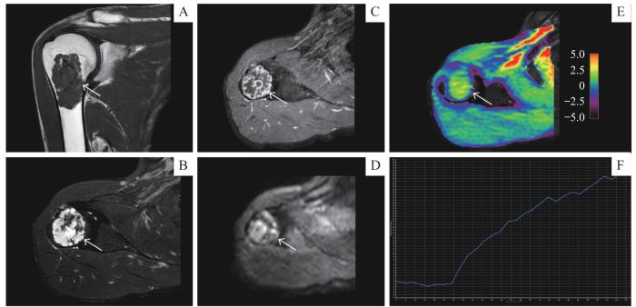 Note: A 52-year-old male with chondrosarcoma of the right humerus. A. Coronal T1-weighted MRI sequence. B. Axial T2-weighted fat-saturated MRI sequence. C. Axial contrast-enhanced T1-weighted MRI sequence. D. Axial DWI ( b=1 000 s·mm -2) sequence. E. Axial APT image fused with axial T2WI (the color bar indicates the APT values). F. TIC classification (type Ⅰ).