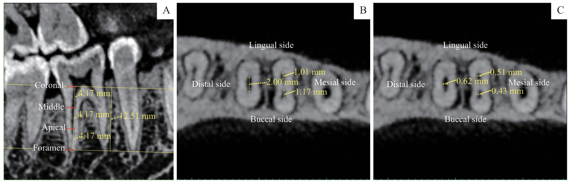 | 图2 测量方法 Note: A. Method of measuring root canal length. The root canal was divided into three equal segments with four levels shown in the figure. B. Method of measuring root canal buccolingual diameters. The lines represent buccolingual diameters of the root canals. C. Method of measuring root canal mesiodistal diameters. The lines represent mesiodistal diameters of the root canals. |