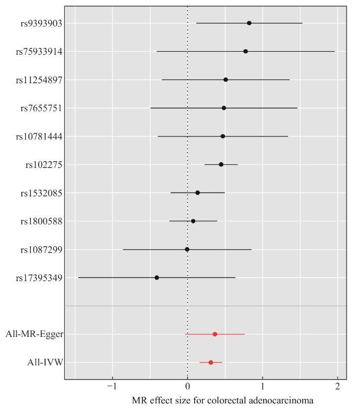 Note: The black dots represent the log ORs for colorectal adenocarcinoma using each PE-associated SNP as an instrumental variable, corresponding to the risk per one standard deviation increase in PE levels. The red dots represent the combined causal estimates, derived using all SNPs as instrumental variables, based on the MR-Egger regression and IVW methods. The horizontal lines represent the 95%CI of the estimates.
