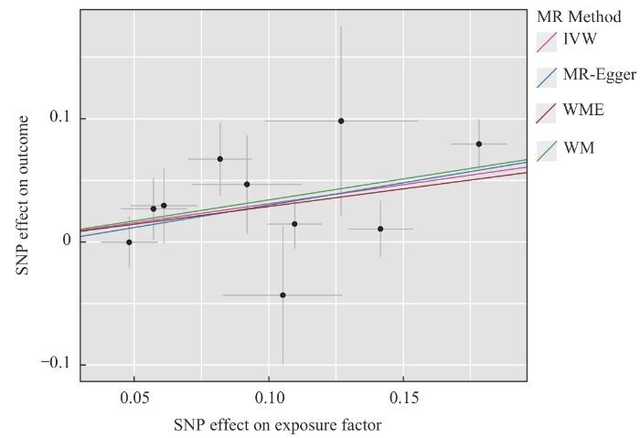 Note: Each dot in this graph represents an instrumental variable; the lines at each dot reflect the 95%CI. The x-axis represents the effect of each SNP on the exposure factor (PE), and the y-axis represents the effect on the outcome (colorectal adenocarcinoma). The colored lines represent the Mendelian randomization fit (MR Fit).