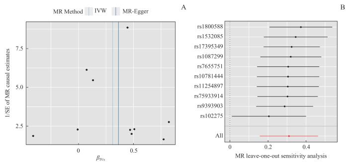 Note: A. The funnel plot visualized the heterogeneity of each genetic variant. B. Leave-one-out plots for sensitivity analysis of the association between PE and colorectal adenocarcinoma.